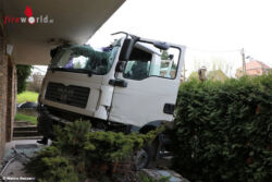 Nachdem die zuständigen Energieversorger die Gas- sowie die Stromzuleitung des vom Lkw getroffenen Einfamilienhauses gesichert hatten, konnte das schwer beschädigte, aber eingeschränkt fahrtaugliche Muldenfahrzeug geborgen werden. Verletzt wurde niemand.