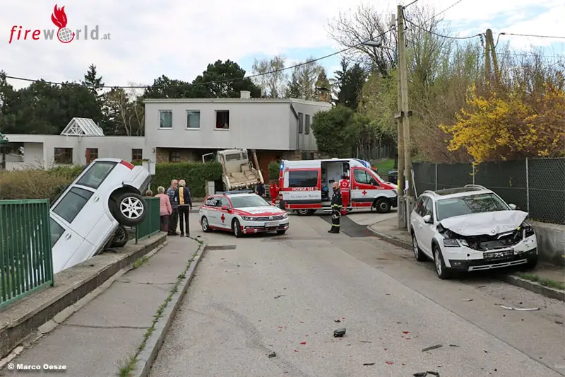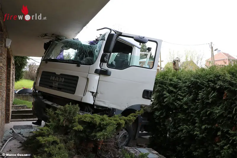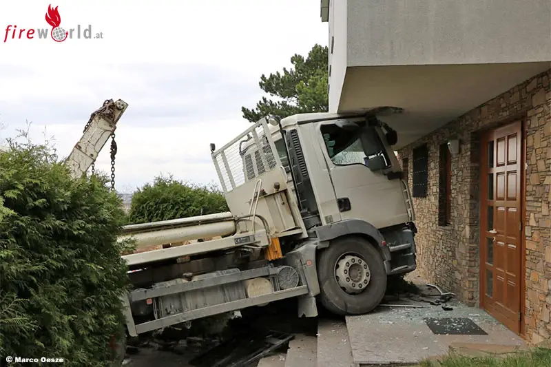 Um 14:19 Uhr wurde die Freiwillige Feuerwehr Brunn am Gebirge zeitgleich mit Exekutive und Rettungsdienst zur Einsatzadresse im Brunner Ortsgebiet alarmiert. An der Einsatzstelle erkundete der Einsatzleiter die Lage und stellte fest, dass ein Pkw mit dem Heck an der Einfriedung eines etwa zwei Meter tiefergelegenen Gartens hing und bei weiterem Abrutschen in die Fassade eines Hauses zu Fahren drohte. Ein weiteres Auto wurde rückwärts gegen einen Hydranten gedrückt. Der Lkw stand schwer beschädigt im Vorgarten eines weiteren Hauses, das durch den Anprall ebenfalls beschädigt wurde.