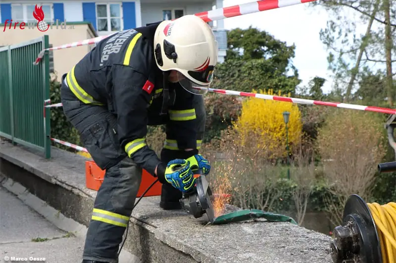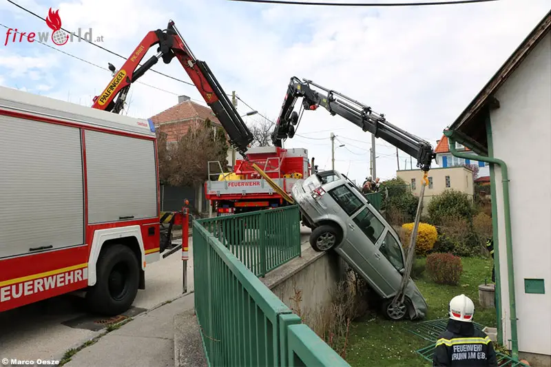 Sofort wurde durch die anwesende Mannschaft ein Brandschutz aufgebaut und begonnen, den absturzgefährdeten Pkw mittel zwei Kränen zuerst zu sichern, im Anschluss gleich zu bergen und gesichert abzustellen. Der zweite Pkw wurde händisch ebenfalls gesichert am Straßenrand abgestellt.