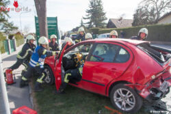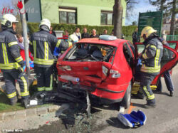 BAD VÖSLAU (NÖ): Feuerwehr und Rettungsdienst arbeiten Seite an Seite, um eine verletzte Frau schonend und schnell aus dem schwer beschädigten Unfallfahrzeug zu retten.