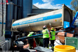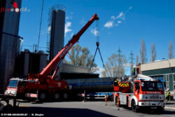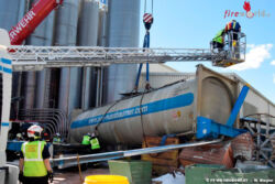 WIENER NEUDORF (NÖ): Die Freiwillige Feuerwehr Wiener Neudorf stand am Nachmittag des 13. April 2018 bei einem Unfall in einem Industriebetrieb im Einsatz. Ein mit 27 Tonnen PVC-Pulver beladener Silo-Lkw stand während des Entladevorgangs auf einem Firmengelände, als der Hydraulikzylinder (zum Anheben des Silos) nachgab und der Aufbau in weiterer Folge kippte.