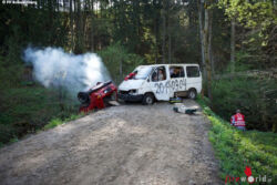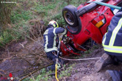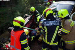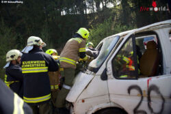 Übungsannahme war ein Verkehrsunfall mit zwei Pkw und einem Kleinbus mit mehreren eingeklemmten und verletzten Personen in Aisthofen. Bei dem in der Böschung am Dach liegenden Fahrzeug musste zuerst ein Entstehungsbrand gelöscht werden und das Fahrzeug mit der Seilwinde gegen Abrutschen gesichert werden, um anschließend mit der Rettung zu beginnen.