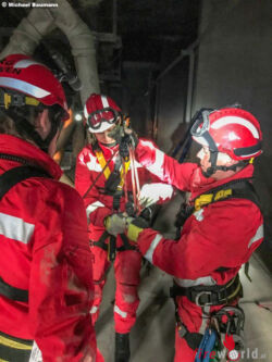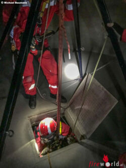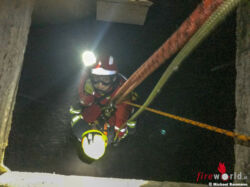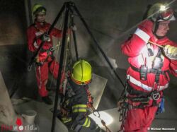 Um die Sicherheit zu gewährleisten, trug dieser das Messgerät ständig bei sich bzw. wurde auch ein zusätzliches Seilsystem aufgebaut, das im Normalfall/Einsatzfall nicht vorhanden sein würde. Danach wurde das Rettungssystem aufgebaut, der Retter abgelassen und im Anschluss beide Männer mittels Vierfach-Flaschenzugs wieder nach oben befördert.