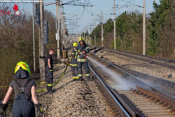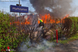 PFAFFSTETTEN (NÖ): Nachdem in den Samstagnachmittag des 14. April 2018 kurz nach 16 Uhr unzählige Passanten auf eine kilometerweit sichtbare Flammenwand und schwarz aufsteigender Rauchsäule im Bereich der Südbahnstrecke zwischen Gumpoldskirchen (Bezirk Mödling) und Pfaffstätten (Bezirk Baden) aufmerksam wurden, gingen im Sekundentakt bei der Feuerwehr Bezirksalarmzentrale Baden eine Vielzahl an Notrufmeldungen ein.