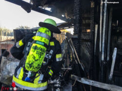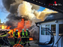 Auf der Anfahrt zum Einsatzort war eine schwarze Rauchsäule gut sichtbar. Beim Eintreffen an der Einsatzadresse war der Brand eines Schuppens bereits voll ausgebildet und die Flammen griffen auf den Dachstuhl des direkt angrenzenden Wohnhauses über. Durch die große Wärmestrahlung waren zudem schon mehrere Fensterscheiben des Wohnhauses geborsten.