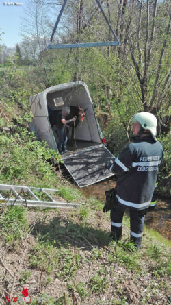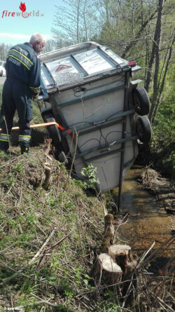 LUDERSDORF-WILFERSDORF (STMK): Aus bisher ungeklärter Ursache hat sich am 19. April 2018 bei einem Pkw mit Pferdeanhänger, (er war auf einer Gemeindestraße im Ortsteil Kötschmanngraben der Gemeinde Ludersdorf-Wilfersdorf unterwegs), in dem sich ein ausgewachsenes Pferd befand, der Anhänger vom Zugfahrzeug gelöst. In Folge dessen ist der Tieranhänger samt Pferd in einen angrenzenden Bach gestürzt.