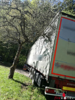 Doch beim weiteren Manövrieren und Reversieren ist der Lenker des Schwerfahrzeuges abermals hängen geblieben. Dieses Mal gestaltete sich der Bergung um einiges schwieriger. Es musste auch ein Baum fachgerecht entfernt werden und der Greifzug kam zusätzlich zur Seilwinde zum Einsatz.