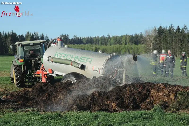 Dass dieser Schein trügte mussten die Männer und Frauen der FF Hoheneich in den Morgenstunden feststellen. Über Nacht begann der Haufen erneut leicht zu Rauchen worauf sie am Morgen zu Nachlöscharbeiten alarmiert wurden. Der Landwirt zerteilte erneut den Misthaufen mithilfe des Frontladers seines Traktors. Ein weiterer Landwirt, der auch Feuerwehrmitglied ist, befüllte sein Vakuumfass mit Wasser um es großflächig über der Brandstelle aufzubringen und unterstützte damit die Löscharbeiten maßgeblich. Nach rund zwei Stunden und mehreren tausenden Litern Wasser konnte nun endgültig „Brandaus" gegeben werden.