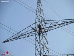 Die Höhenrettungsgruppe der Berufsfeuerwehr Augsburg entschied sich, nach der Abschaltung der Leitungstrasse durch Spezialisten der LEW zu einem Aufstieg auf den ca. 50 Meter hohen Mast, um das Tier zu befreien. Ein Höhenretter stieg gesichert auf den Mast und befreite den bereits müden Falken aus seiner Zwangslage.
