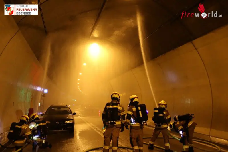 Die Feuerwehren Ebensee und Traunkirchen fuhren jeweils mit ihrem RLF-A 2000 über den Fluchtstollen in den Tunnel ein und erkundeten die Lage im Tunnel. Nachdem die ersten Atemschutztrupps vorgedrungen waren, wurde ein brennender Pkw mitten im Tunnel vorgefunden.