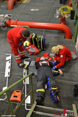 Während den Löscharbeiten wurde nach Annahme im Übungsablauf ein Feuerwehrmitglied im Pumpenhaus verletzt. Das Rote Kreuz wurde in das Gelände beordert, um die Versorgung des verletzten Kameraden durchzuführen und mit Unterstützung der Feuerwehr, den stabilisierten Kameraden aus dem Tanklager zu bringen.