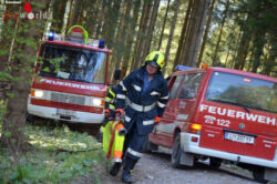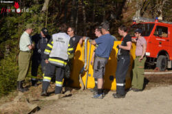 In der Zwischenzeit kam es aufgrund der enormen Anstrengungen während der Löscharbeiten zu einem Unfall eines Feuerwehrkameraden (Übungsannahme), welcher durch die anwesenden Bergretter entsprechend erstversorgt und aus dem unwegsamen Gelände gerettet werden musste.