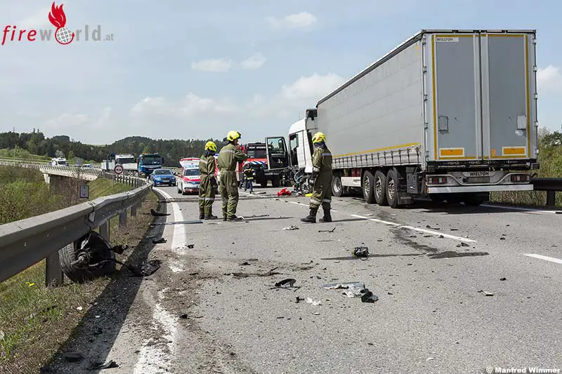 RASTBACH (NÖ): Ein Unfall zwischen einem Pkw und einem Sattelzug führte am Nachmittag des 25. April 2018 zu einer Totalsperre der B37 in Höhe Rastbach. Ein in Richtung Krems fahrender Pkw kam aus ungeklärter Ursache auf die Gegenfahrbahn und prallte dort seitlich, kurz vor der ersten Achse, gegen das entgegenkommende Schwerfahrzeug.