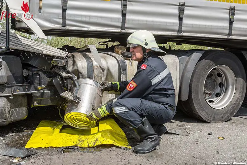 Parallel zu den Rettungsarbeiten wurden von den weiteren Einsatzkräften der Feuerwehr ein massiver Dieselaustritt aus dem beschädigten Kraftstofftank des Sattelzugfahrzeugs gestoppt. Das bereits ausgelaufene Dieselöl wurde durch das großflächige Aufbringen von Ölbindemittel gebunden. Mit einer elektrisch betriebenen Treibstoffpumpe eines Feuerwehrkameraden aus Rastbach wurde der noch im Tank verbliebene Treibstoff abgepumpt.