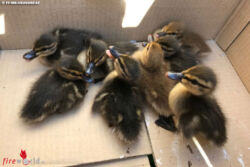 Besorgte Autofahrer meldeten eine Entenfamilie, die nahe einer Tankstelle in einem Straßengraben, vermutlich verschreckt durch den Verkehr, festsaß. Mit mehreren Keschern und beherzten Handgriffen wurde die Entenmutter mit ihren acht Küken von den ausgerückten Feuerwehrmännern eingefangen und an einem nahegelegenen Bach wieder ausgelassen.