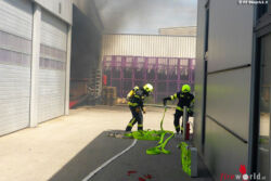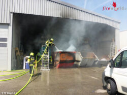Am Einsatzort fand Einsatzleiter BR Ari Hahn einen in Vollbrand stehenden Container in einer überdachten Halle vor "Es bestand die Gefahr das Flammen auf die Lagerhalle übergreifen", berichtet Feuerwehr-Einsatzleiter Hahn. Dies konnten die Einsatzkräfte durch den raschen Einsatz mehrerer C-Strahlrohre unter schwerem Atemschutz verhindern. Dennoch gab es eine weitere Gefahr. In der Halle neben dem Container lagerten fünf Gasflaschen.