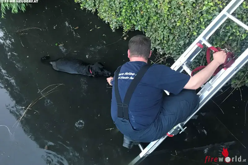 Während eines Spazierganges weckte eine Ente den Jagdtrieb eines Hundes. Im Zuge der Verfolgungsjagd sprang die Hündin in den Mödlingbach konnte diesen aber aufgrund der hohen Steinmauer nicht mehr verlassen. Nach einigen Versuchen den Hund wieder ans Land zu locken wählten die Besitzerinnen den Feuerwehrnotruf 122 und baten um Hilfe.