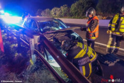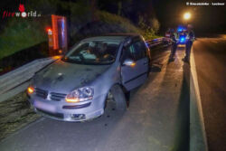 Auf Höhe Baukilometer 7 kam ein mit zwei Personen besetzter Pkw aus noch unbekannter Ursache von der Fahrbahn ab, überfuhr einen Abwasserschacht und schlitterte in Folge die rechte Randleitschiene entlang.