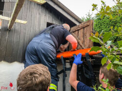 Auf einem „Spineboard“ genannten speziellen Rettungsbrett wurde der Patient schonend gelagert und schließlich in Teamwork aus Feuerwehr, Rotem Kreuz und Polizei aus dem Dachboden gerettet. Er wurde zur weiteren Behandlung mit der Rettung ins Krankenhaus verbracht. Für Einsatzleiter Florian Kollmann ist klar, dass „der Patient seinen aufmerksamen Nachbarn diese schnelle Rettung zu verdanken hat, sie haben absolut richtig reagiert. Durch das tolle Teamwork der Einsatzkräfte konnte er rasch aus der misslichen Lage gerettet werden.“