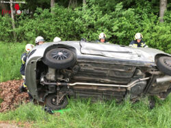 Er konnte gleich feststellen, dass keine Personen eingeschlossen waren. Ein Motoradfahrer war in einer leichten Rechtskurve mit einem entgegenkommenden Pkw kollidiert. Der Pkw kam von der Fahrbahn ab und blieb auf der linken Fahrzeugseite liegen. Das Motorrad lang etwa 50 Meter weiter auf der Fahrbahn.