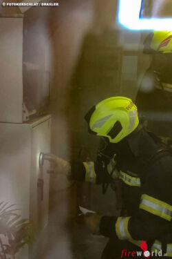 Bei Erkundung der Lage wurde eine starke Rauchentwicklung und im Vorraum der Brand festgestellt. Der Einsatzleiter erkannte die Situation richtig und wartet das Eintreffen der Polizei ab um die Vorgehensweise der Brandbekämpfung am Tatort abzusprechen. Da es anfangs nicht möglich war, den Bankomat zu öffnen, um den Brand ablöschen zu können, wurde unter Verwendung von CO2– Löschern der Brand in Bankomat von außen immer wieder eingedämmt.