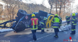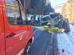 VILLACH (KTN): Kurz vor 10 Uhr Vormittags meldete am 6. Februar 2019 die Polizei der Feuerwehreinsatzzentrale einen Verkehrsunfall auf der B100 Drautalbunde Straße im Stadtgebiet von Villach. Ein mit einem Bagger beladener Anhänger soll umgestürzt sein und Betriebsmittel ausfließen.