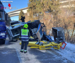 Unverzüglich wurde die Hauptfeuerwache Villach, die FF Vassach und die örtlich zuständige FF Fellach gemäß Alarmplan alarmiert. Am Einsatzort konnte die Meldung der Polizei bestätigt werden. Ein Lkw-Anhänger mit einem Bagger war auf der Fahrbahn ins Schleudern geraten und umgestürzt. Aus dem Bagger traten Betriebsmittel aus und ergossen sich auf die Fahrbahn. Eine Sperre der Bundestraße musste vorgenommen werden. Glücklicherweise wurden bei diesem Unfall keine weiteren Fahrzeug beschädigt und keine Personen verletzt.