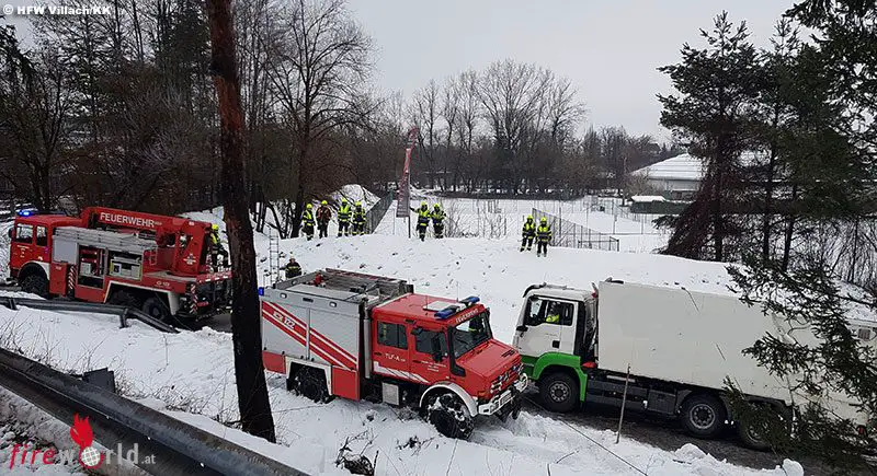 VILLACH (KTN): Kurz nach 10:30 Uhr teilte am 11. Februar 2019 der Einsatzzentrale Villach ein Mitarbeiter einer Entsorgungsfirma über den Feuerwehrnotruf mit, das in Warmbad bei Villach ein Müllwagen von der Fahrbahn abgekommen sei und umzustürzen drohe.