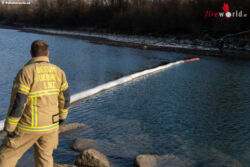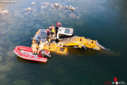 Die Feuerwehr legte eine Ölsperre aus. Die Bergung des Baggers soll dann am Donnerstag ein Unternehmen durchführen.