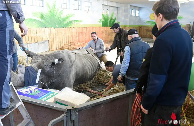 MÜNCHEN (BAYERN): Am Samstagvormittag, 16. Februar 2019, musste ein Breitmaulnashorn vom Zirkus Krone wegen Bauchschmerzen untersucht werden. Dass dies kein leichtes Unterfangen sein wird, wussten die Tierärzte bereits und forderten deshalb Unterstützung der Feuerwehr an.