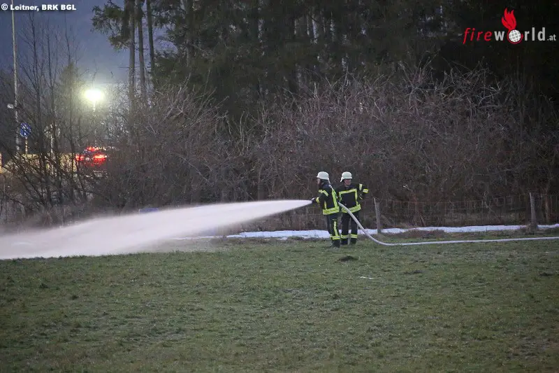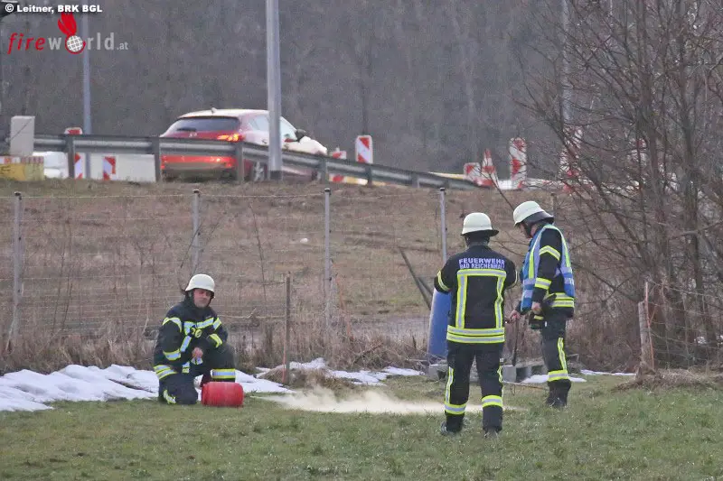 Nach Rücksprache mit dem Gefahrguttrupp des Polizeipräsidiums Oberbayern Süd brachten die Beamten die Flasche auf eine Wiese zwischen der Autobahn und der Zufahrt zum Pferdestall Buchenhof, wo sie die Einsatzkräfte der nachgeforderten Feuerwehr Bad Reichenhall kontrolliert entleeren konnten. Die Feuerwehren Bad Reichenhall und Piding und der Löschzug Marzoll waren mit 30 Einsatzkräften vor Ort. Das Rote Kreuz sicherte die Arbeiten mit Rettungswagen und Einsatzleiter ab, wobei niemand verletzt wurde. Die Feuerwehr sicherte den Einsatzort, ab, stellte den Brandschutz sicher, maß die Gaskonzentration, reinigte das Feld mit einem Strahlrohr und entfernte die geleerte Flasche mit einer Bergungsverpackung vom Einsatzort. Der Einsatz dauerte rund eine Stunde.