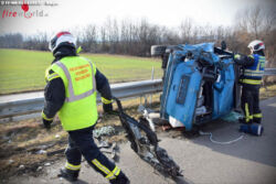 WIENER NEUDORF (NÖ): Auf der Südostautobahn (A3) ereignete sich am Nachmittag des 20. Februar 2019 ein schwerer Verkehrsunfall zwischen einem Lkw-Zug und einem Pkw-Gespann. Nach dem Zusammenstoß kam der Lkw samt Anhänger von der Fahrbahn ab und stürzte um.