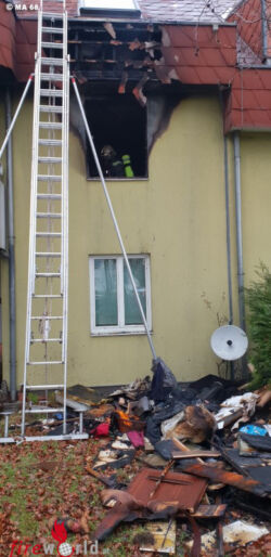 Zeitgleich wurde mit der zweiten, im Außenangriff eingesetzten Löschleitung ein Flammenüberschlag auf andere Bereiche des Gebäudes verhindert. Die notfallmedizinische Versorgung des Mannes wurde vom Team der Berufsrettung Wien übernommen. Der Mann musste zur weiteren Behandlung mit dem Wiener Rettungshubschrauber in ein Krankenhaus gebracht werden.