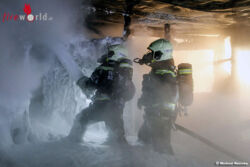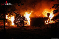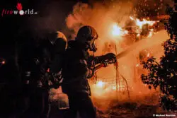 Vor Ort zeigte sich, dass eine ältere Person und Ihr Hund das Gebäude selbstständig verlassen konnte. Laut Auskunft des Bewohners befanden sich auch keine weiteren Personen mehr im Haus. Das zu großen Teilen aus Holz errichtete Wohnhaus stand in Vollbrand als der erste Atemschutztrupp zum Löschangriff vorging.
