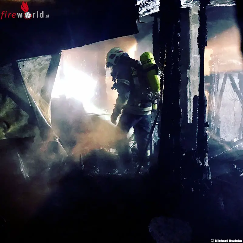 Nach wenigen Minuten rücken die ersten Fahrzeuge aus dem Zeughaus aus, zeitgleich machten sich die Bisamberger Freiwilligen auf den Weg zum Einsatzort. Schon bei der Anfahrt erkannte der Einsatzleiter den Feuerschein des brennenden Gebäudes in einem entlegenen Gebiet des Bisambergs.