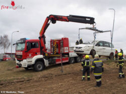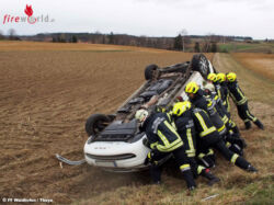 Beim Eintreffen des Vorausrüstfahrzeug konnte rasch Entwarnung gegeben werden. Der Fahrer konnte sich alleine aus dem Fahrzeug befreien. Da keine Menschenrettung mehr erforderlich war, wurde der Einsatz der Feuerwehr Thaya noch während der Anfahrt über Funk storniert. Gemeinsam mit der örtlich zuständigen Feuerwehr Altwaidhofen wurde die Einsatzstelle abgesichert und eine Verkehrsregelung im Kreisverkehr durchgeführt. Nach der Unfallaufnahme durch die Polizei wurde der Unfallwagen mit Muskelkraft auf die Räder gestellt und mit dem Ladekran des Wechselladefahrzeuges vom Acker geborgen. Anschließend erfolgte der Abtransport von der Unfallstelle.