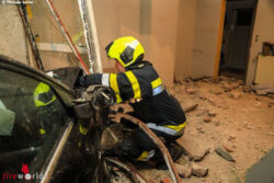 Bereits nach wenigen Minuten trafen 18 Mann der Feuerwehr Knittelfeld, Rotes Kreuz und Polizei am Unfallort ein um mit den Rettungsmaßnahmen zu Beginnen. Die Feuerwehr traf dabei anfangs Absperrmaßnahmen am Unfallort, baute den doppelten Brandschutz auf und zog das verunfallte Fahrzeug mittels Seilwinde aus dem Geschäft schildert Einsatzleiter Löschmeister Daniel Schmied von der Feuerwehr Knittelfeld.