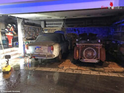 Deutschland: Doppelgarage mit zwei historischen Fahrzeugen in Bruchsal in Brand