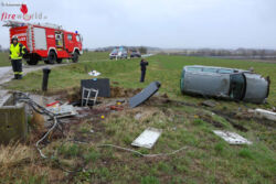 Das Auto krachte frontal in eine Pumpstation und überschlug sich in ein angrenzendes Feld. Der Pkw-Lenker konnte sich selbst aus dem Fahrzeug befreien, Ersthelfer betreuten ihn bis zum Eintreffen der Rettungskräfte. Die Feuerwehr sicherte die Unfallstelle ab und führte die Aufräumarbeiten durch. Am Auto entstand vermutlich Totalschaden, die Steueranlage der Pumpstation, ein Stromverteilerkasten und die Einfassung des Schachtes wurden durch den Crash zerstört. Die Mistelbacher Straße war im Kreuzungsbereich mit der Oberprischinger Straße rund eineinhalb Stunden nur wechselseitig passierbar.