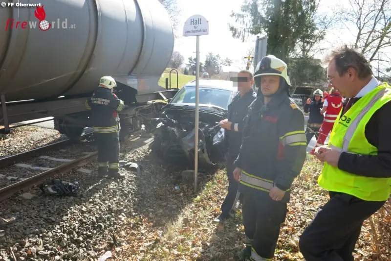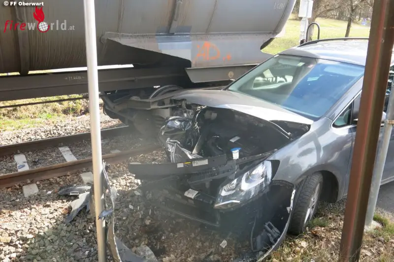 OBERWART (BGLD): Am Montag, dem 11.03.2019, wurde die Feuerwehr Oberwart zu einer Fahrzeugbergung auf einem Bahngleis nahe der kath. Kirche alarmiert. Ein Güterzug hatte einen Pkw gerammt.