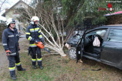 PÖLFING-BRUNN (STMK): Am Montag, dem 11.03.2019, wurde die Freiw. Feuerwehr Pölfing-Brunn um 6:57 Uhr per Sirene zu einem Verkehrsunfallunfall auf der L605 Höhe Pölfing-Dorf alarmiert. Aus noch unbekannter Ursache verlor ein Pkw-Lenker die Kontrolle über sein Fahrzeug, kam von der Straße ab und krachte in einen Baum.