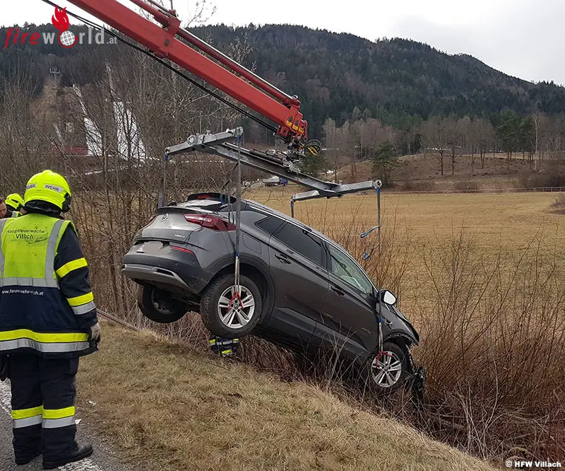 VILLACH (KTN): Kurz nach 13.00 Uhr meldete am 13. März 2019 eine Autofahrerin einen Verkehrsunfall auf der B86 in der Nähe der Villacher Alpen Arena, wobei ein Fahrzeug im Straßengraben liegen und sich noch eine Person im Auto befinden solle.