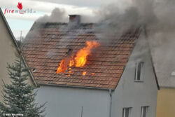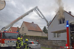 Laut Nachbarn sollten sich die Hausbesitzer, ein älteres Ehepaar, noch im Haus aufhalten. Sofort wurde die Eingangstüre in das Einfamilienhaus durch den ersten Atemschutztrupp aufgebrochen. Währenddessen baute die restliche Besatzung eine C-Löschleitung auf. Zeitgleich ließ der Einsatzleiter das Alarmstichwort auf „B2-Obergeschoss (Dachstuhlbrand) mit vermissten Personen“ erhöhen. Die Feuerwehren Ebenfurth (NÖ), Hornstein und Eisenstadt nachalarmieren. Hier sei erwähnt, dass sich die Drehleiter der Feuerwehr Neufeld gerade beim 10-Jahres-Service befindet und deshalb die Teleskopmastbühne Eisenstadt als nächstes Hubrettungsgerät alarmiert wurde.