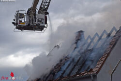 Für die weiteren Löscharbeiten (Zwischendecken, Dachstuhl, Spitzboden) kamen noch ein Atemschutztrupp der FF Neufeld und der FF Hornstein zum Einsatz. Die Löscharbeiten im oberen Bereich des Dachstuhls wurden über die Teleskopmastbühne durch zwei Mann der FF Eisenstadt unter Atemschutz durchgeführt.