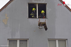 Parallel erkundete der Einsatzleiter die Lage genauer und erfragte, dass das Ehepaar schlecht gehfähig und deshalb wahrscheinlich im Erdgeschoss anzutreffen sei. Aufgrund dieser Information wurde zuerst das fast rauchfreie untere Geschoss durchsucht, wobei niemand gefunden werden konnte. Daraufhin machte sich der erste Atemschutztrupp über das enge Stiegenhaus auf den Weg in den ausgebauten Dachbereich. Da sich die Rauchgrenze auf der vorletzten Stufe befand und durch Berge diverser Kleidung, Zeitungen und Zeitschriften ein „standardmäßiges Durchsuchen“ nahezu unmöglich machte, musste nach hydraulischer Ventilation ein Teil des ersten Zimmers im Obergeschoss ausgeräumt werden, bevor ein weiteres Vordringen möglich war.