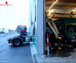 Bei laufendem Motor verwechselte er jedoch vermutlich das Brems- mit dem Gaspedal und die Zugmaschine fuhr über die Straße gegen die Metallwand der Lagerhalle, die erheblich beschädigt wurde. Der im Führerhaus befindliche Lkw-Fahrer zog sich hierbei schwere Verletzungen zu und wurde mit dem Rettungshubschrauber in eine Klinik geflogen. Eine akute Lebensgefahr konnte ausgeschlossen werden.