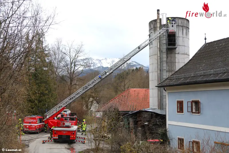 Oö: Drei Feuerwehren nach Verpuffung im Silo eines Holzverarbeitungsbetriebes in Scharnstein im Einsatz