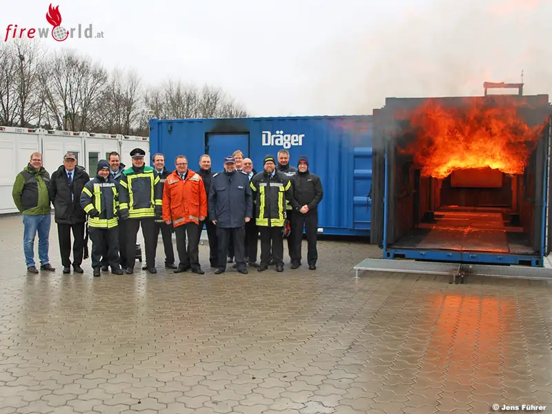 Als Highlight dieses Tages wurde durch die Feuerwehrkameraden aus dem Landkreis Verden eine Besichtigung der Realbrandausbildungsanlage Dräger Fire 8000 organisiert. Die ca. 10 minütige Fahrt zur Feuerwehrtechnischen Zentrale in Verden wurde in Fahrgemeinschaften vorgenommen und zwei ausgebildete Kameraden stellten die Anlage, welche im Oktober 2018 eingeweiht wurde, ausführlich vor. Den interessierten Feuerwehröffentlichkeitsarbeitern wurde sichtlich warm, als dann noch ein Flash-Over beim Gruppenfoto demonstriert wurde.