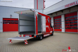 Für Einsatzfahrten verfügt der Mercedes Benz über zahlreiche LED-Blaulichter im Kofferaufbau und im Fahrgestell sowie über einen modernen LED-Blaulichtbalken auf dem Führerhaus. Die Bedienung sämtlicher Sondersignale erfolgt über ein einfaches Handbedienteil, welches auch für die Steuerung der LED-Verkehrsleitanlage oberhalb der Ladebordwand verwendet werden kann. Als weiterer Sicherheitsaspekt verfügt der Sprinter über eine Rückfahrkamera. Zur Kommunikation im Einsatzfall steht ein digitales Fahrzeugfunkgerät zur Verfügung. In drei zusätzlichen Staukästen konnten diverse Hilfsmittel zur Ladungssicherung und die feuerwehrtechnische Beladung laut Baurichtline untergebracht werden.