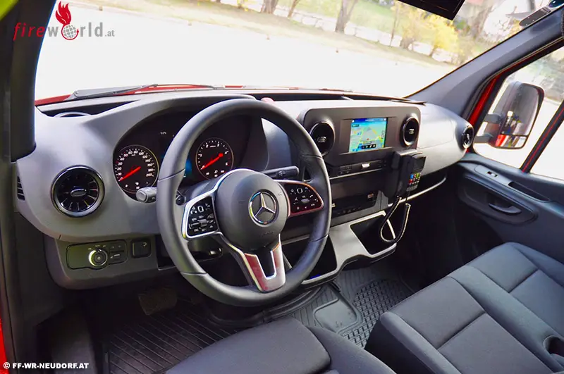 Für Einsatzfahrten verfügt der Mercedes Benz über zahlreiche LED-Blaulichter im Kofferaufbau und im Fahrgestell sowie über einen modernen LED-Blaulichtbalken auf dem Führerhaus. Die Bedienung sämtlicher Sondersignale erfolgt über ein einfaches Handbedienteil, welches auch für die Steuerung der LED-Verkehrsleitanlage oberhalb der Ladebordwand verwendet werden kann. Als weiterer Sicherheitsaspekt verfügt der Sprinter über eine Rückfahrkamera. Zur Kommunikation im Einsatzfall steht ein digitales Fahrzeugfunkgerät zur Verfügung. In drei zusätzlichen Staukästen konnten diverse Hilfsmittel zur Ladungssicherung und die feuerwehrtechnische Beladung laut Baurichtline untergebracht werden.